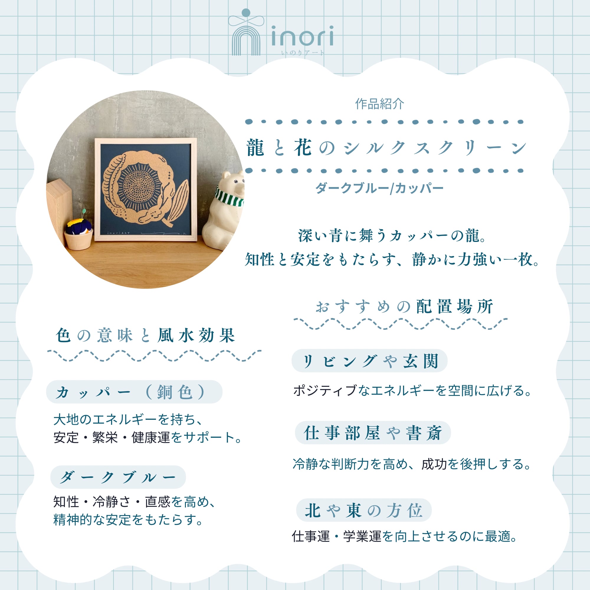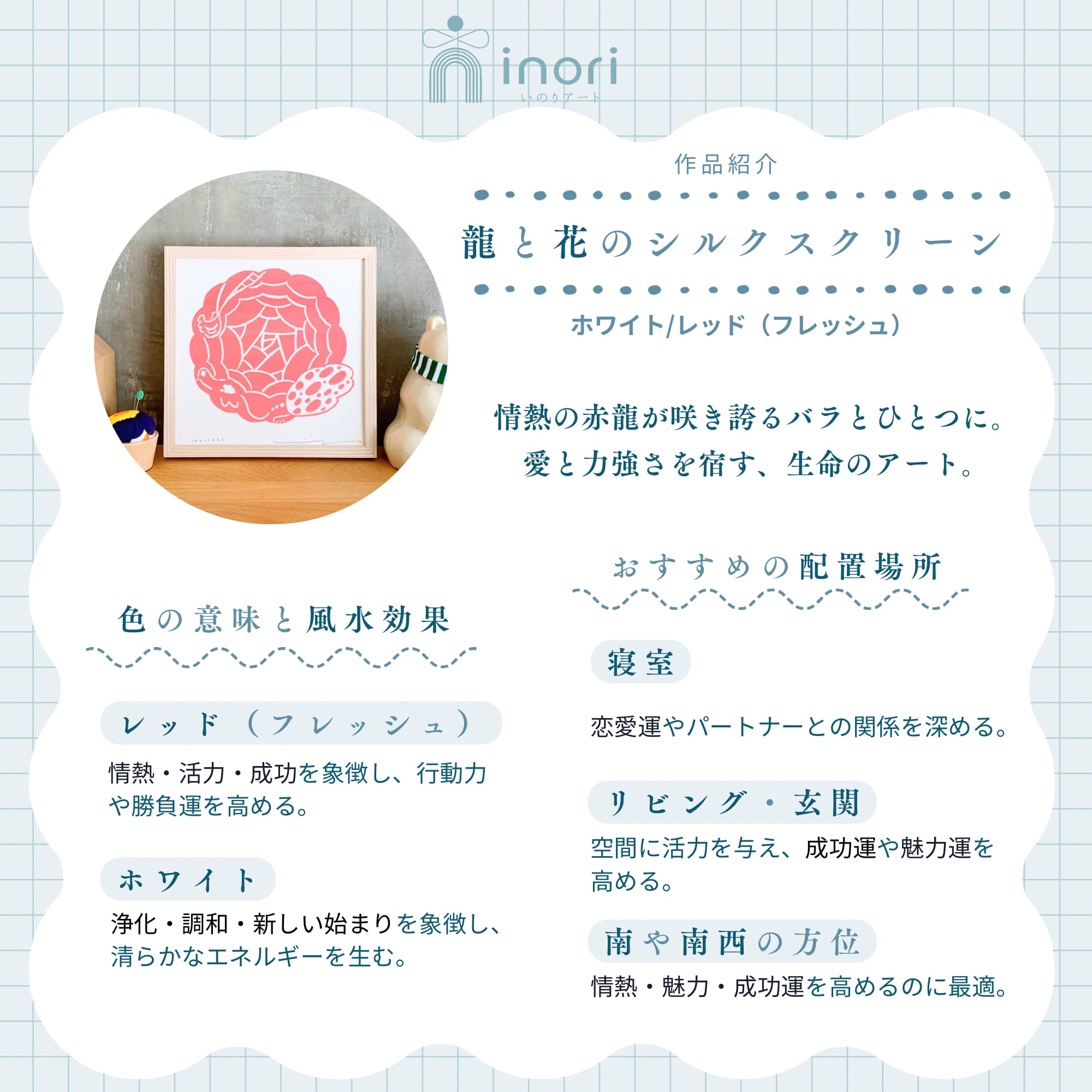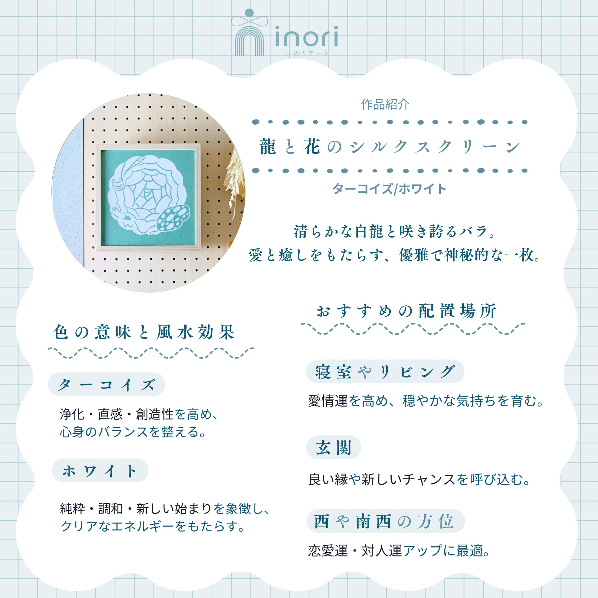 inoriARTは、 心が落ち着くアートを届けるブランドです。 北欧インテリアに馴染むミニマルな美しさ、 そして風水の調和を大切にしたデザインを 融合させ、 空間にそっと寄り添うような アートポスターを展開しています。 飾ることで、心が整い、 穏やかで前向きな気持ちになれる—— そんな“祈り”のような存在を目指しています。 忙しない日々の中で、 ふと目にしたときに心が安らぐ。 大切な誰かに贈りたくなるような、 幸運と癒しを感じられるアート。 inoriARTの提案するライフスタイルです。